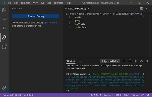 VS Code est un éditeur de code gratuit et open-source qui peut s'installer sur les systèmes d'exploitation Windows, macOS et Linux. Téléchargeable sur le site : https://visualstudio.microsoft.com/fr/free-developer-offers Après l'installation, VS Code n'est qu'un simple éditeur de code ne supportant que le service et le débogage de JavaScript, il faut ensuite installer des extensions pour les langages désirés (Python, C/C++, C#, Java...), on peut aussi télécharger des outils complémentaires. Au premier lancement de l'application, une fenêtre demande de choisir l'extension pour le langage de programmation désiré. On peut aussi à tout moment ajouter un langage par le bouton Paramètres en bas et à gauche. La version actuelle est la version 1.43.0 ciblant Net Core (plateforme de développement open-source actuellement en version 3.2). Cette version est pratique et agréable à utiliser. ![]() Le code s'écrit dans la partie de droite en haut, la partie inférieure est réservée aux sorties. On lance l'exécution du programme par le menu Run (Start Debugging) de la barre des menus en haut ou par la touche de fonction F5 |