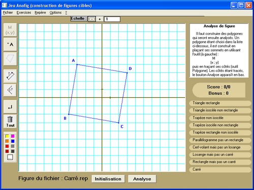 Une fois la figure réalisée (avec ses côtés tracés), on peut cliquer sur le bouton Analyse pour vérifier la construction. Le bouton Analyse reste actif (ce qui permet de modifier la construction et de la vérifier de nouveau).