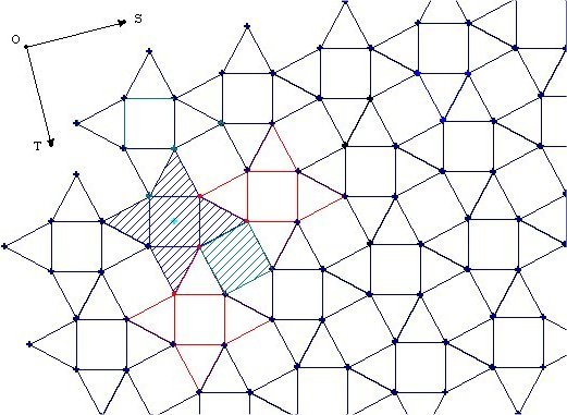 Puis le compléter (sans oublier d'utiliser les translations inverses pour couvrir tout l'écran) ou ouvrir une figure déjà complétée, il suffit alors de changer de translations (déplacer les points S et T) pour obtenir un des autres pavages (un exemple fig 4) :