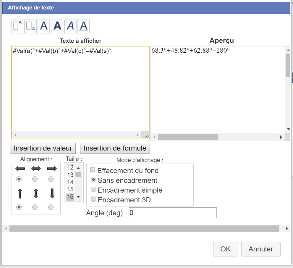 Positionner le curseur dans le champ texte puis cliquer sur le bouton Insertion de valeur et, dans la nouvelle fenêtre qui s'ouvre, sélectionner le calcul a. Finir en cliquant sur le bouton OK, le premier affichage dynamique s'inscrit dans le champ texte. Continuer en tapant ° (degré) puis le signe + et cliquer de nouveau sur le bouton Insertion de valeur pour insérer l'affichage de b, faire comme pour a, de même pour c. Finir par le signe = et insérer la valeur de s puis taper ° (degré). Valider le commentaire par le bouton OK. Le commentaire s'affiche avec les valeurs actuelles de a, b, c et s.