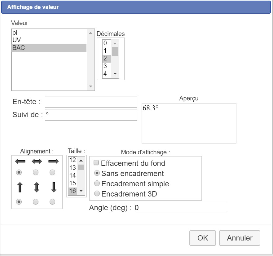Lorsque l'affichage n'est pas automatique, pour afficher la valeur d'un angle et lier cette affichage au sommet correspondant, il faut cliquer sur l'outil Affichage de valeur lié à un point , puis cliquer sur un sommet. Une boîte de dialogue s'ouvre pour demander la valeur à afficher :