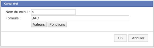 Par exemple, dans le champ Nom du calcul, taper a puis cliquer sur le bouton Valeurs et sélectionner la valeur BAC et valider, le champ Formule contient alors BAC, valider par le bouton OK. Définir de même les calculs b et c avec les deux autres mesures. Créer un nouveau calcul pour la somme en donnant le nom s et dans le champ Formule taper : a+b+c. On peut maintenant créer le texte avec affichage dynamique.