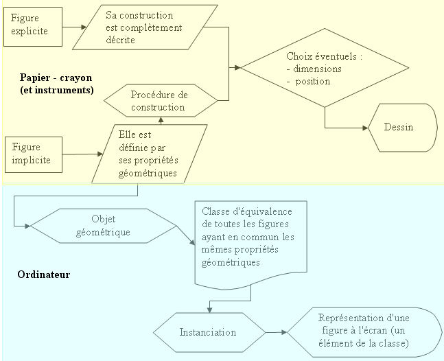En réalité, d'un point de vue informatique (langage orienté objet), une figure est une réunion d'objets élémentaires (points, segments, droites, cercles, ...) ou d'objets calculés (images par transformation, valeurs numériques, fonctions, ...) instanciés en même temps pour former la représentation à l'écran.