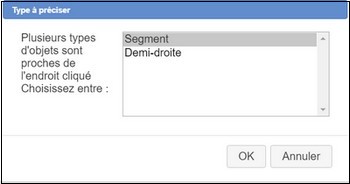 Pour désigner un objet construit, il faut approcher la souris de l'objet jusqu'à l'affichage d'un texte précisant le type d'objet puis cliquer sur l'objet. Lorsqu'il y a plusieurs objets au voisinage de la souris, le texte "A préciser" apparaît au lieu du nom de l'objet. Si on clique une boîte de dialogue apparaît pour désigner l'objet voulu :