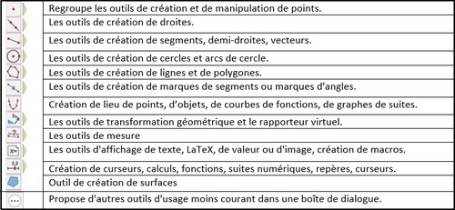 Tous les outils de construction sont dans la barre d’outils verticale à gauche. En haut de cette barre apparaît une main (outil Capturer) qui permet de déplacer certains points (voir ci-dessous). En dessous, les outils sont rangés par catégorie. La première catégorie (en dessous de la main) contient les outils relatifs à la construction de points. En cliquant sur la flèche à droite de l’icône (ou en double-cliquant sur l’icône, on déroule tous les outils d’une catégorie. Il suffit de cliquer sur un outil pour le sélectionner (il est alors mémorisé et son icône apparaît pour la catégorie). Remarque : certains outils ne sont disponibles que si le contexte le permet.