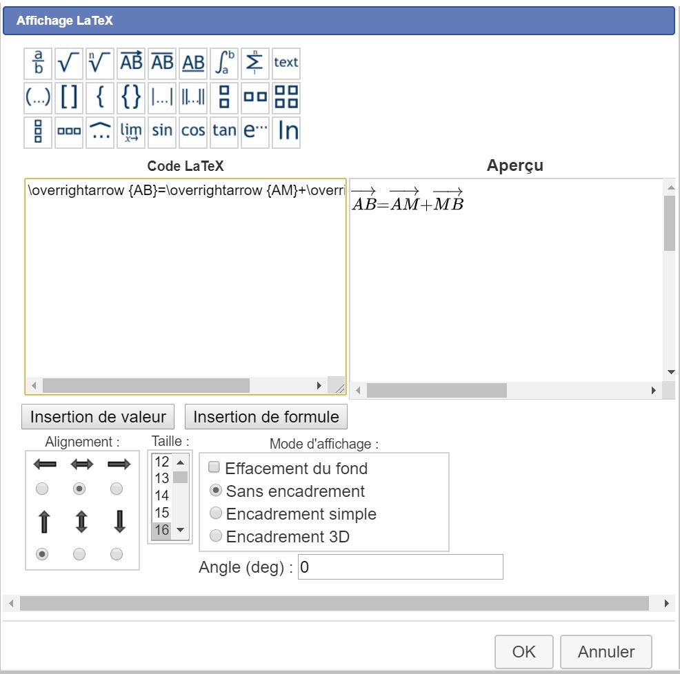 Dans cette boîte, des modèles (en haut) facilitent quelques écritures comme par exemple celle de vecteurs. Un clic sur le modèle donne l'écriture LateX, il n'y a plus qu'à compléter les crochets.