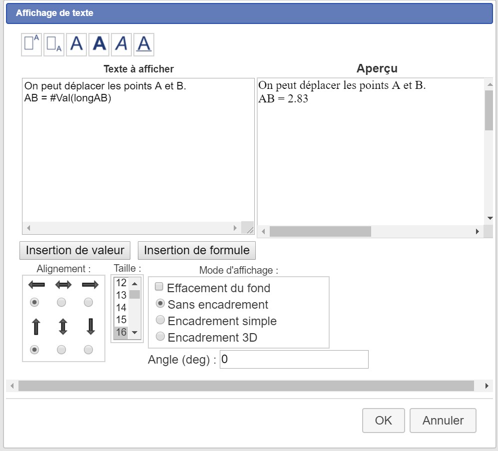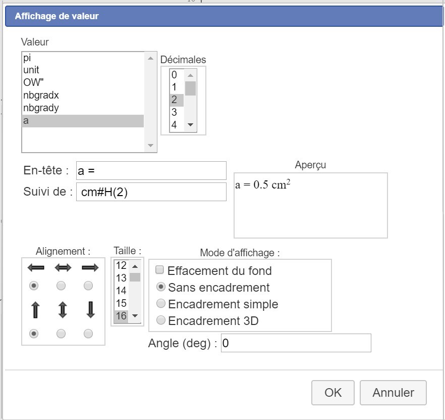 Les champs En-tête et Suivi de peuvent contenir des mises en formes ou des caractères spéciaux. Pour connaître la syntaxe, voir Affichages spéciaux et Affichage de code LateX dans l'aide. Par exemple écrire cm², il faut écrire : cm#H(2) Si on souhaite lier un affichage de valeur à un point, il faut cliquer sur l'outil Affichage de valeur lié à un point , puis cliquer sur le point voulu. On obtient alors la même boîte de dialogue que ci-dessus.