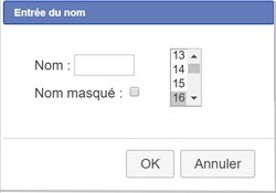 Après la création d'un point ou d'une droite, un cadre apparaît près du point ou de la droite, il suffit alors de taper au clavier une lettre majuscule ou minuscule (suivie éventuellement d'un chiffre) et de valider. Si on ne veut pas de nom, il suffit d'appuyer sur la touche Echappement ou sur un autre outil. Après la création de points et de droites, on peut les nommer ou renommer par l'outil Nommer . Il faut cliquer sur cet outil (dans la barre horizontale) puis approcher le pointeur de la souris prêt du point ou de la droite : une bulle d'indication apparaît (ce point ou cette droite) et en cliquant sur le point ou la droite ainsi désigné, une petite fenêtre s'affiche pour demander le nom :Dans cette boîte de dialogue, on peut également choisir la taille des caractères et masquer (ou démasquer) le nom (c'est parfois utile).Un fois validée (par le bouton Ok) la fenêtre se referme et le nom apparaît au voisinage du point ou de la droite :En cliquant sur l'outil Déplacer , le curseur de la souris se transforme en main dès qu'il se rapproche d'un nom. En cliquant sur un nom et en maintenant le bouton de la souris enfoncé, on peut déplacer le nom en l'entrainant vers une autre position au voisinage du point ou de la droite (la liaison entre le point ou la droite et son nom est conservée). L'outil reste actif et on peut déplacer d'autres noms. Il deviens inactif dès que l'on clique sur un autre outil ou encore en appuyant sur la touche Echappement.