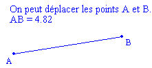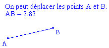 On peut également introduire des affichages dynamiques de valeurs (sauf de mesures, voir l'aide pour connaître la syntaxe). Par exemple pour afficher la longueur d'un segment (AB étant sa mesure), il faut définir une variable (car une mesure ne peut être affichée directement) de nom longAB et de formule AB et taper dans la boîte de dialogue du Texte AB = #Val(longAB) ou taper AB = et cliquer sur le bouton Insertion de valeur pour choisir la valeur. On obtient alors l'affichage :