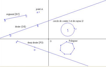 Construire deux nouveaux points et les nommer I et J. Puis avec l'outil Cercle , créer le cercle de centre O et passant par le point J. Construire sept nouveaux points sans les nommer et avec l'outil Polygone , créer le polygone dont les sommets sont ces sept points. Pour finir le polygone, après avoir cliquer sur le septième sommet cliquer de nouveau sur le premier sommet ou sur le bouton Stop qui apparaît à droite sous la palette des couleurs. Avec l'outil Affichage de texte , créer les affichages qui précisent le nom des objets.