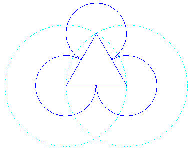 Construire un segment puis un triangle équilatéral ayant pour côté ce segment. Pour cela utiliser l'outil Cercle, et construire les deux cercles ayant pour centre l'une des extrémité du segment et passant par l'autre extrémité. Définir l'intersection des deux cercles par l'outil Intersection Construire un triangle équilatéral en utilisant l'outil Segment Les cercles sont maintenant inutiles, on peut les masquer par l'outil Gomme, cliquer sur cet outil puis sur chacun des cercles. Les cercles existent toujours (ils sont simplement rendus invisibles) comme on peut le constater en cliquant sur l'outil Démasquer (les cercles apparaissent en pointillés, il suffirait de cliquer sur chacun d'eux pour les rendre de nouveau visibles). Construire le milieu de chaque côté en utilisant l'outil Milieu Construire les trois arcs de cercles de centre chaque sommet et d'extrémités les milieux des côtés du triangle en utilisant l'outil Grand arc. Cliquer sur cet outil puis sur le centre du premier arc, cliquer ensuite sur l'origine de l'arc (un milieu des côté) puis sur l'extrémité (un milieu d'un autre côté). On obtient la figure suivante (sans les cercles représentés ici en pointillés) :