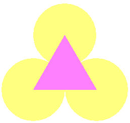 Définir maintenant le triangle comme polygone par l'outil Polygone et en cliquant successivement sur les trois sommets du triangle (puis cliquer de nouveau sur le premier sommet pour finir). Sélectionner dans la palette de styles pour le remplissage des surfaces le style plein puis une couleur. Cliquer sur l'outil Surface puis cliquer sur un arc de cercle, recommencer l'opération pour les deux autres arcs. Changer de couleur et créer la surface pour le triangle. On obtient une figure comme celle ci :