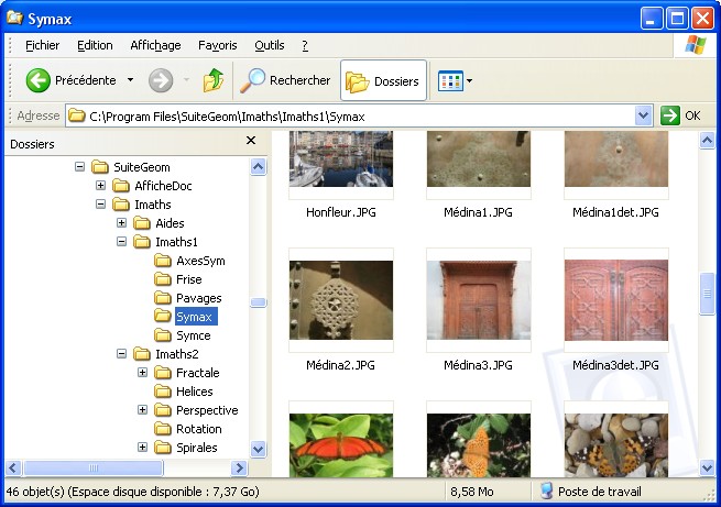 Pour ouvrir une image d'Imaths dans un autre logiciel, on peut facilement la retrouver car toutes les images sont dans des sous-dossiers du dossier de l'application. Par défaut, si à l'installation le dossier proposé n'a pas été changé, l'application se trouve dans le dossier : C:\Program Files\SuiteGeom\Imaths et les images dans le sous-dossier correspondant au volume :