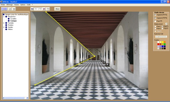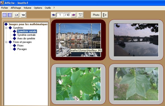 Imaths est un album de photos pour la géométrie surtout en collège (symétrie axiale, centrale, frise, pavages, perspectives ...). L'objectif est de rendre les cours de mathématiques plus vivant, plus dynamique, en stimulant la curiosité des élèves. Le logiciel Imaths est conçu pour un visionnement collectif mais on peut aussi prévoir des activités avec des questionnaires individuels, Imaths étant suffisamment simples d'emploi pour être manié par des élèves (l'item Aide, du menu ?, donne un aperçu des fonctionalités et une prise en main du logiciel).