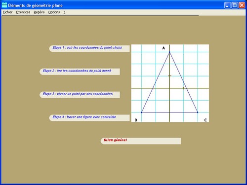 Ce logiciel (gratuit) permet d'appréhender la notion de coordonnées d'un point dans un repère. Quatre étapes sont proposées : - Etape 1 : affichage et saisie des coordonnées de points placés avec la souris ; - Etape 2 : exercice de lecture des coordonnées de points donnés ; - Etape 3 : exercice de placement de points donnés par leurs coordonnées ; - Etape 4 : exercice de tracé de polygones (triangles et quadrilatères) par les coordonnées des sommets. Chaque étape affiche un score qui est repris dans un bilan général accessible directement par la page d'accueil.