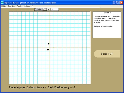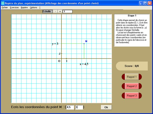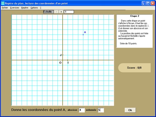 Dans cette étape un point s'affiche dans le repère (O, I, J). Il faut lire les coordonnées de ce point (le quadrillage facilite cette lecture) et saisir son abscisse et son ordonnée. Cette étape propose une série de 10 points. La position des points est tirée au hasard et l'échelle s'ajuste automatiquement aux coordonnées. En cas de mauvaise réponse, les coordonnées du point s'affichent dans le repère.