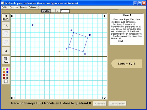 Cette étape est plus créative. On demande de tracer des polygones en plaçant les sommets par leurs coordonnées. Elle se compose de quatre exercices. Chaque exercice impose : - un des quatre quadrants du repère (numéroté de I à IV) - le type de figure à construire (carré, triangle isocèle, trapèze isocèle, parallélogramme) Le choix des coordonnées des sommets reste libre (les conditions précédentes ne sont vérifiées qu'à l'analyse de la figure). Pour construire une figure, on dispose des outils situés à gauche de l'écran (de haut en bas) : Placer point, Modifier point, Tracer polygone, Afficher longueurs, Annuler, Tout effacer. Le bouton Analyse vérifie le polygone construit (le logiciel reconnaît les figures suivantes : triangle, triangle rectangle, triangle isocèle, triangle rectangle isocèle, triangle équilatéral, quadrilatère, quadrilatère croisé, trapèze, trapèze rectangle, trapèze isocèle, parallélogramme, rectangle, cerf-volant, losange, carré).