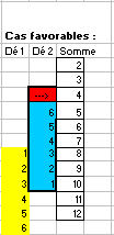 Le bouton RAZ permet d'effacer le contenu du tableau, les cellules des faces tirées ainsi que celle contenant le nombre de lancers pour le lancer automatique. Mais on peut cliquer plusieurs fois sur les boutons Lancers manuels ou Lancers automatiques, sans effacer par le bouton RAZ, dans ce cas les lancers sont cumulés. On peut constater que même avec 100, 200, 500 lancers voire 1000, on peut être assez loin des fréquences attendues. Pour calculer la probabilité d'un évènement (la somme des faces obtenues lors d'un lancer simultané de deux dés), on peut visualiser les cas favorables pour chaque somme avec la partie droite de la feuille. Il suffit de sélectionner toutes les cellules correspondant au dé 2 (la cellule rouge et les cellules bleues) et de les déplacer en positionnant le curseur sur la bordure de la sélection de manière à ce que la cellule rouge pointe avec la flèche sur la somme voulue (ici la somme 4). Les cellules des deux dés ayant un bord commun donnent les cas favorables (ici pour la somme 4 : 1 + 3, 2 + 2 et 3 + 1). Le nombre total d'évènements est la somme des cas favorables de chaque face.