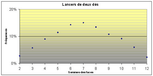 Et en dessous un graphique donnant les fréquences de chaque somme possible se remplit automatiquement.
