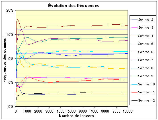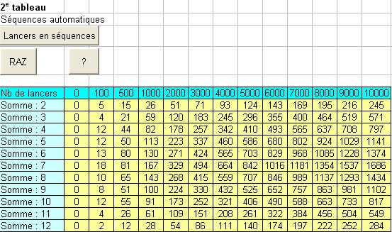 La deuxième feuille de calcul (onglet Lancer 2) affiche un deuxième tableau et un graphique. Le bouton Lancers en séquences sous le libellé "Séquences automatiques" réalise 10000 lancers simultanés de deux dés en plusieurs étapes. Chaque étape permet de compléter le tableau (et donc le graphique) avec des résultats intermédiaires. Le tableau obtenu pour 10000 lancers, donne pour chaque somme un nombre d'apparitions assez proche de celui attendu. Un tableau supplémentaire (en dessous du premier) donne ces résultats en pourcentage pour réaliser automatiquement le graphique de l'évolution des fréquences de chaque somme en fonction du nombre de lancers.