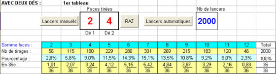 En ouvrant le fichier, on obtient un classeur avec deux feuilles de calcul. La première (onglet Lancers 1) affiche un premier tableau. Le premier bouton Lancers manuels réalise, coup par coup, le lancer simultané des deux dés. Le bouton Lancers automatiques effectue, en continu, le nombre de lancers simultanés indiqué dans la cellule à droite. Il faut penser à valider après avoir tapé le nombre dans cette cellule. Dans les deux cas, on voit s'afficher les faces obtenues et s'inscrire, dans le tableau, la somme des deux faces.