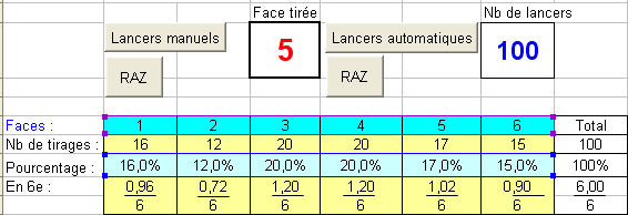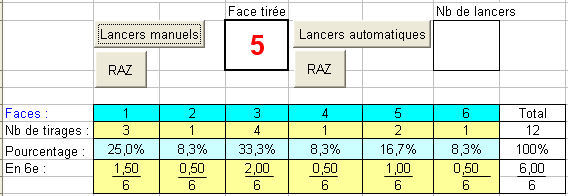 Le bouton RAZ permet d'effacer le contenu du tableau, la cellule de la face tirée ainsi que celle contenant le nombre de lancers pour le lancer automatique.