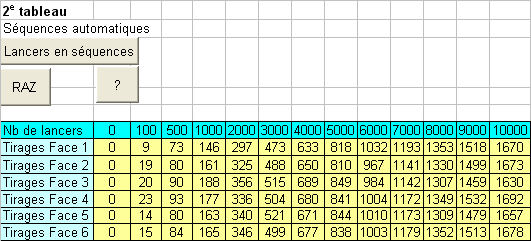 Le bouton Lancers automatiques réalise le nombre de lancers indiqué dans la cellule à droite (sans arrêt). Il faut penser à valider après avoir tapé le nombre dans cette cellule. Le tableau se remplit automatiquement ainsi que le graphique.