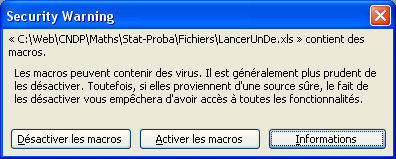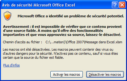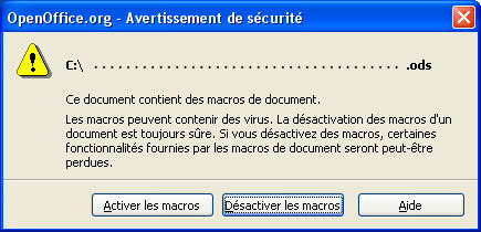 L'ouverture d'un document contenant une macro non signée ou une macro signée par une source inconnue, provoque (avec les options par défaut) l'ouverture de la boîte de dialogue Avertissement de sécurité. On peut alors activer ou désactiver les macros.