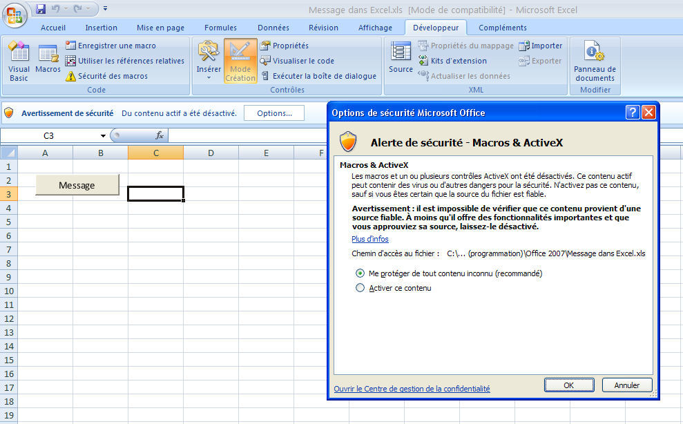A l’ouverture d’un document au format Office 2007 contenant du code (macro enregistrée ou code écrit) office 2007 affiche un avis de sécurité : On peut alors activer ou non les macros.