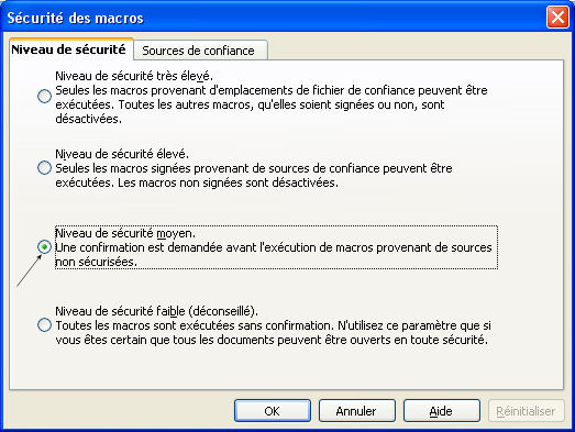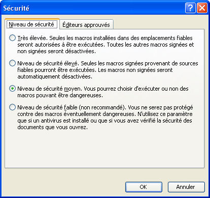 Dans le menu Outils, Macro, cliquer sur Sécurité, on obtient la boîte de dialogue suivante : Il faut cocher Niveau de sécurité moyen pour avoir, à l'ouverture d'un classeur contenant du code, une boîte de dialogue demandant si on veut rendre actif le code (on a donc le choix d'activer ou non les macros ou programmes en fonction de la provenance du classeur).