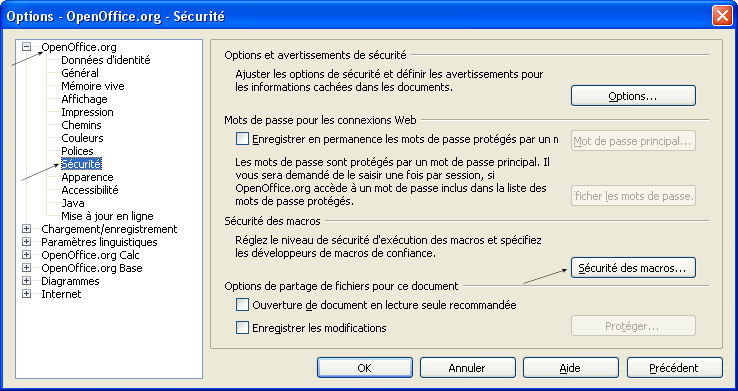 Pour définir les options, choisir Outils - Options - OpenOffice.org - Sécurité puis cliquer sur Sécurité des macros.
