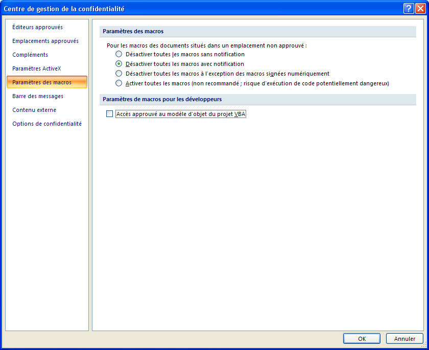 On peut modifier ce niveau de sécurité en cliquant sur Sécurité des macros à gauche dans le ruban Développeur. On obtient la boîte de dialogue suivante : Il n'est pas conseillé d'activer toutes les macros de manière permanente (on peut le faire provisoirement si on est sûr des fichiers que l'on utilise).