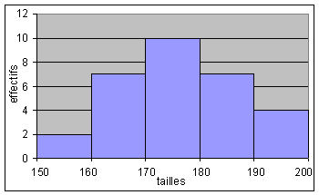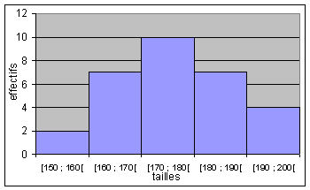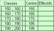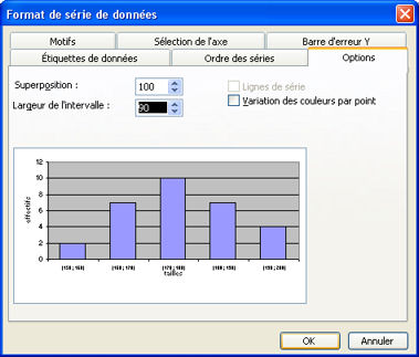 Remarques : 1) Pour calculer la moyenne "pondérée" avec les classes, il est nécessaire d'introduire une colonne supplémentaire pour afficher le centre des classes. 2) Avec Excel ou Calc d'OpenOffice, on peut modifier le graphique pour qu’il ressemble à un histogramme (les classes ont la même amplitude), il faut élargir les barres (car en réalité le graphique initial est un diagramme en barres) par l’option Format de la série de données du menu contextuel obtenu en cliquant avec le bouton droit de la souris après avoir sélectionné les barres. Dans la boîte de dialogue obtenue, prendre l’onglet Options et réduire la largeur de l’intervalle à 0.