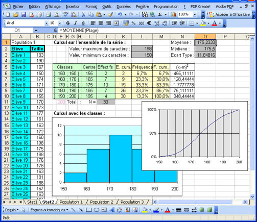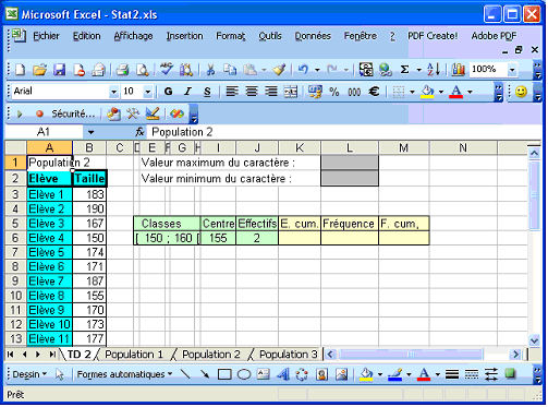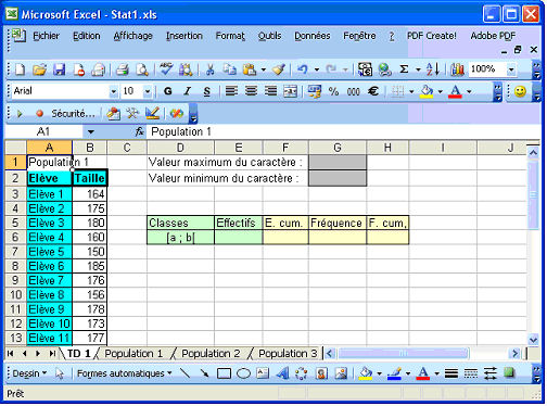 1er niveau Téléchargement du fichier Excel (Stat1.xls, 53 ko), du fichier Calc (Stat1.ods, 15 ko) Pour regrouper les valeurs d’une série statistique en classes et étudier un certain nombre de caractéristiques, le classeur suivant suffit : Il contient une feuille principale de travail (TD1) et 3 autres feuilles qui permettent aux élèves de travailler avec des valeurs différentes de la série (il suffit de copier les données dans la feuille de travail). On peut demander aux élèves de nommer la zone des valeurs de la série en "Taille" (par le menu Insertion puis la commande Nom, Définir) ce qui simplifie grandement la saisie de formules On peut ensuite demander de :
