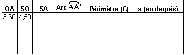 Dans ces études, ils auront à compléter avec des formules le tableau ci-dessous pour calculer la mesure de l'angle (ils auront à utiliser dans Excel la fonction PI et la fonction RACINE) : - dans la première étude, OA est égale à 3,6 cm dans toute la première colonne, SO est incrémentée ; - dans la deuxième étude, SO est égale à 4,5 cm dans toute la deuxième colonne, OA est incrémentée.