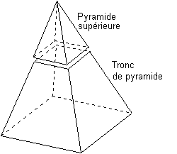 Soit la pyramide régulière SABCD dont la base est le carré ABCD. Sa hauteur est SO. On coupe la pyramide SABCD par un plan parallèle à la base. Ce plan coupe [SO] en O'. La partie basse est le tronc de pyramide A’B’C’D’ABCD et la partie supérieure une pyramide réduite SA'B'C'D'.