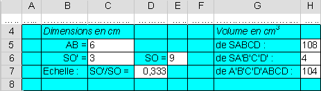 Puis de vérifier les volumes obtenus avec les données de la fiche élève. On demande ensuite de voir si les volumes sont égaux pour O’ au milieu de [SO] et, en modifiant les dimensions de la pyramide (en C5 et E6), de relever les volumes correspondants.