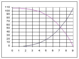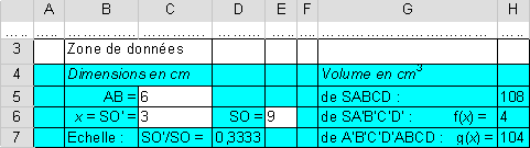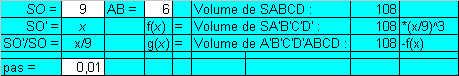 Il s’agit, de faire varier la position du point O’, c’est à dire la longueur SO’ (dans la cellule C6) pour remplir le tableau situé juste en dessous dans la même feuille de calcul. Les élèves doivent donc relever pour chaque valeur de x, le volume f(x) de la pyramide réduite et le volume g(x) du tronc de pyramide. Le graphique se trace alors automatiquement au fur et à mesure.
