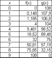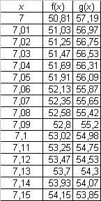 Dans cette feuille, la zone “Mise en équation” ci-dessus est donnée et les élèves doivent la comprendre pour écrire les formules pour f(x) et g(x) à la première ligne du tableau ci-contre. Il faut également écrire une formule pour incrémenter les valeurs de x en tenant compte du pas. La valeur minimale à donner à x est bien évidemment celle trouvée dans la deuxième partie (valeur approchée par défaut). En recopiant ces formules vers le bas, et en réduisant le pas, on obtient les valeurs ci-contre.