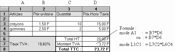 L'utilisation d'adresses relatives ou absolues composées uniquement de lettres ou de chiffres ne facilite pas la compréhension ultérieure du fonctionnement d'une formule. Quoi de plus abstrait que la formule B7*D6 (ou L7C2*L6C4 ). Rien n'indique, sauf à examiner méticuleusement le tableau, qu'il s'agit du taux de TVA multiplié par le total hors taxes.