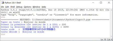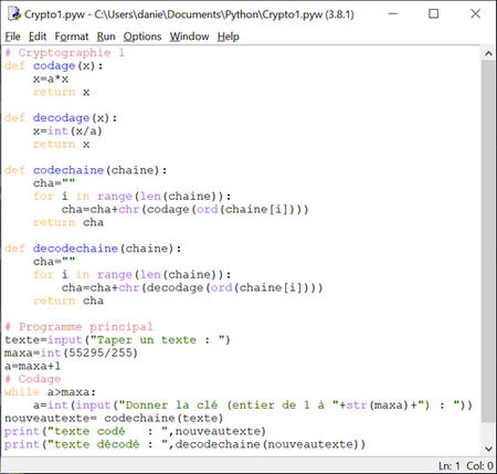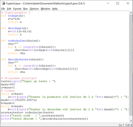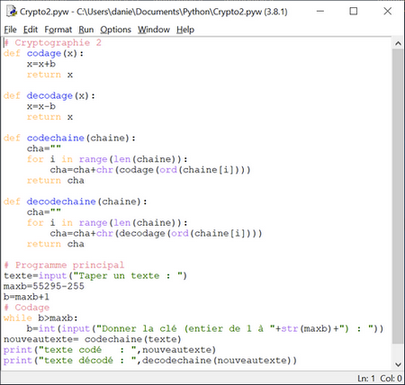 Première partie Le premier exercice sera donc de créer un petit programme permettant d'afficher le caractère correspondant au code donné puis de faire l'inverse. On utilisera les fonctions ord() et chr() du langage python qui donnent respectivement le code d'un caractère donné et le caractère d'un code donné. ![]() La fonction input() renvoyant une chaîne de caractères, il faut la convertir en un entier par la fonction int(). On peut ainsi obtenir le code des caractères accentués (é, è, à) et de quelques autres caractères (ç, @, #, &, ...) Quel est le caractère obtenu avec le code (unicode) 8730 ? Deuxième partie Créons un petit programme qui transforme un texte avec un cryptage utilisant une fonction linéaire f telle que f(x)=ax où a est un entier naturel. Naturellement il faudra veiller à ce que le code obtenu après application de la fonction f ne dépasse pas 65534. On considérera que le texte écrit en français n'aura aucun caractère dont le code dépassera 255. Ce programme devra comporter deux fonctions (une pour le codage et l'autre pour le décodage) qui n'appliquent respectivement que la fonction f ou la fonction inverse aux codes des caractères. Deux autres fonctions seront chargées d'extraire pour le codage (respectivement le décodage) les codes des caractères du texte tapés et de renvoyer la chaîne codée (respectivementdécodée). ![]() Le programme principal ne s'occupe que des entrées et d'appeler les fonctions pour les sorties. Télécharger ce programme pour Python. En exécutant ce programme, on obtient par exemple : ![]() Troisième partie Même exercice que le précédant mais en utilisant une fonction affine f, telle que f(x) = x + b ![]() Le programme diffère peu du précédent. Télécharger ce programme pour Python. Quatrième partie Même exercice que le précédant mais en utilisant une fonction affine f, telle que f(x) = ax + b. Il faudra introduire la saisie d'une deuxième clé (pour b) et chercher la fonction inverse. On pourra prendre arbitrairement un petit nombre pour la première clé (pour a) et calculer la limite supérieure de la deuxième clé. ![]() Télécharger ce programme pour Python. En exécutant ce programme, on obtient par exemple : ![]() |