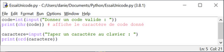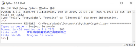Pour protéger un texte, on peut le transformer pour qu'il ne soit plus lisible par tout le monde mais seulement par les personnes qui connaissent la transformation ou plus exactement la transformation inverse qui rétablira le texte d'origine. On fait alors du cryptage à l'aide d'une ou plusieurs clés. L'dée, pour un cryptage simple d'un texte, est d'utiliser le code x (utilisé par l'ordinateur) de chaque caractère du texte et de leur appliquer une fonction f pour afficher le caractère de code f(x) à la place du caractère de code x. Pour décrypter le texte, il suffit d'appliquer la fonction inverse. Il faut connaître le système de codage utilisé par son ordinateur, plus exactement utilisé par le système d'exploitation (Windows, Linux, ...). En effet, plusieurs systèmes de codage sont apparus au cours du temps. On peut retenir (avec Windows Xp et versions ultérieures) que les codes doivent être dans la plage [0, 55295] et que les caractères utilisés dans la langue française sont dans la plage [0, 255], plus précisément pour les lettres de l'alphabet :