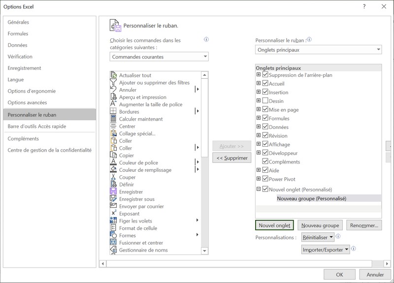 Ajouter un onglet et un groupeCliquer avec le bouton droit de la souris sur la barre des onglets puis sur Personnaliser le ruban pour obtenir la fenêtre Options Excel.