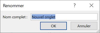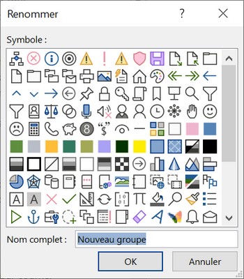 Dans cette boîte cliquer sur le bouton Nouvel Onglet en bas en dessous de la liste des onglets existants : Un nouvel onglet s'ajoute à la liste (Nouvel onglet (Personnalisé)) qui contient un nouveau groupe (Nouveau groupe personnalisé). Cliquer sur ce nouvel onglet puis sur le bouton Renommer (en bas à droite). Une boîte de dialogue apparaît pour saisir le nom du nouvel onglet. A la place de «Nouvel onglet», taper par exemple «Perso» Puis sélectionner le nouveau groupe et cliquer sur le bouton Renommer, on obtient la boîte suivante : On peut choisir une icône, cliquer par exemple sur l'icône