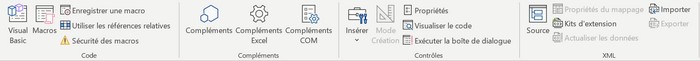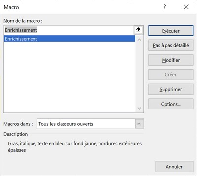 Préparation Pour écrire une macro ou une procédure, Il faut commencer par afficher l'onglet Développeur (la procédure est identique avec Excel et Word) : cliquer avec le bouton droit sur la barre d'accès rapide ou sur le ruban, puis cliquer sur Personnaliser le ruban, on obtient la fenêtre des options suivante : ![]() Dans la liste de gauche, cliquer sur Personnaliser le ruban et à droite dans la liste des onglets principaux cocher Développeur et valider (bouton OK). En cliquant sur l’onglet Développeur, on obtient alors (avec Word) le ruban suivant : ![]() Avec Excel on obtient un ruban analogue (identique pour les fonctions que l'on utilisera) : ![]() Travail avec Excel Enregistrement On peut enregistrer une macro dans un classeur Excel ou dans un classeur particulier : Personnal.xlsb (dans ce cas toutes les macros contenus dans ce classeur seront actives pour tout classeur ouvert sur le même ordinateur). Pour débuter on enregistrera la macro dans le classeur ouvert. Ouvrons donc un nouveau classeur et vérifier que l'onglet Développeur est présent. Dans la feuille de calcul, sélectionner deux cellules adjacentes (n'importe lesquels) puis dans l'onglet Développeur, dans le groupe Code, cliquer sur Enregistrer une macro : ![]() Une boîte de dialogue apparaît dont on doit compléter les champs : ![]() Dans cette boîte, il faut donner le nom de la macro (sans espace) par exemple Enrichissement puis de manière facultative, on peut donner une touche de raccourci et un bref descriptif de la macro. La liste déroulante Enregistrer la macro dans permet de choisir le classeur dans lequel sera enrgistrée la macro : Ce classeur (choix par défaut), Nouveau classeur (Excel ouvrira un nouveau classeur à la fermeture de la boîte de dialogue, ou dans le classeur de macros personelles (classeur Personnal.xlsb évoqué plus haut). Gardons le choix par défaut (Ce classeiur). Sans cliquer dans la feuile de calcul, cliquer sur l'onglet Accueil puis sur Gras, Italique puis sur l'icône Couleur de police et choisir la couleur "bleue" dans les couleurs standarts, puis cliquer ensuite sur l'icône Couleur de fond et choisir la couleur "jaune", enfin cliquer sur l'icône Bordure et choisir Bordures extérieures épaisses Une fois ces actions faites, cliquer de nouveau sur l'onglet Développeur puis sur Arrêter l'enregistrement.. La première macro est enregistrée ! Exécution Remarques : Pour exécuter la macro, commencer par sélectionner des cellules puis taper le raccourci clavier précédement enregistré (ici Ctrl + e) : il faut maintenir enfoncée la touche Contrôle (Ctrl) et appuyer sur la lettre e en minuscule. Minuscule et Majuscule sont différenciées pour les raccourcis. On peut aussi exécuter la macro par l'onglet Développeur, et cliquer sur Macros dans le groupe Code ce qui ouvre une boîte de dialogue qui permet de choisir la macro à exécuter : ![]() Dans cette boîte de dialogue on peut aussi retrouver et modifier les informations (touche de raccourci et descriptif) de la macro sélectionnée par le bouton Options... Une fois la macro sélectonnée, cliquer sur le bouton Exécuter pour lancer la macro. Voila la première macro exécuter ! En tapant du texte dans une des cellules à fond jaune, le texte se met en gras, italique et eu couleur bleue