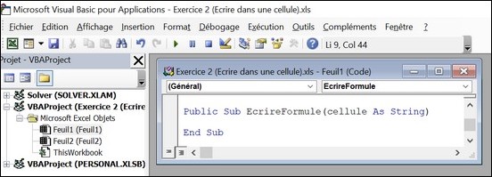 Ecrire la formule dans une autre feuille Ajouter maintenant un bouton de commande dans la feuille 2 et appeler avec ce bouton la procédure EcrireFormule pour écrire la formule dans la cellule E4 de la feuille 2 (attention il faut d'abord activer cette feuille dans le code). Ressources (documents à télécharger)