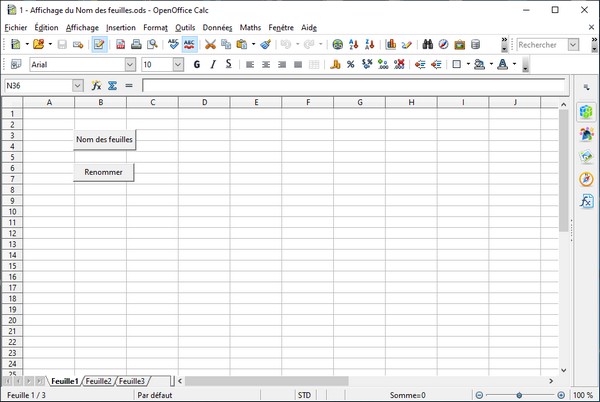 RéalisationCommencer par ouvrir un nouveau classeur et sur la feuille 1, dessiner deux boutons. Changer la propriété Titre des boutons comme ci-dessus. On peut également changer la propriété Nom de ces boutons mais ce n'est pas très utile. Sauver le classeur sous le nom TP1.xls. CodeDans la fenêtre Macros OpenOffice Basic (Alt F11), ajouter un module à la bibliothèque représenté par le classeur. Afficher le nom des feuillesDans l'environnement de développement, effacer la procédure Main et écrire une nouvelle procédure AfficherNom dans laquelle il faut :