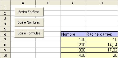| - écrire dans la cellule la formule pour écrire la racine carrée du nombre contenu dans la cellule situé sur la même ligne et la première colonne du tableau (la référence pour une formule étant de type A1, il faut concaténer un texte (une lettre) avec le numéro de ligne mis sous forme de texte avec la fonction Str, texte dont on doit retirer l'espace devant (réservé au signe) avec la fonction Mid ou LTrim). | Affecter cette procédure à l'évènement Bouton de souris enfoncé du troisième bouton EcrireFormules (Voir Comment lier une procedure à un évènement). Enregistrer le classeur et tester cette procédure Ressources (documents à télécharger)