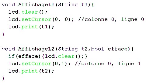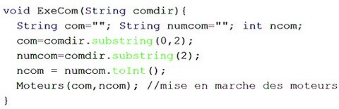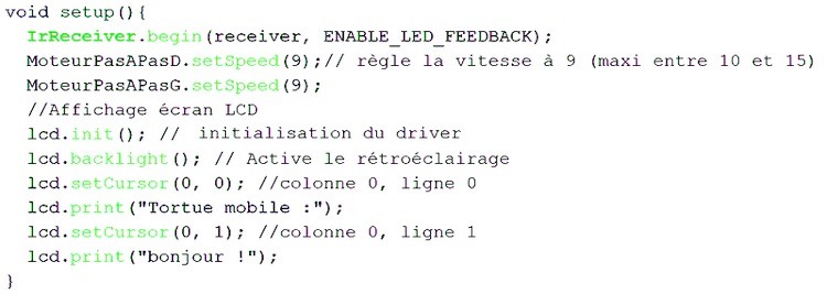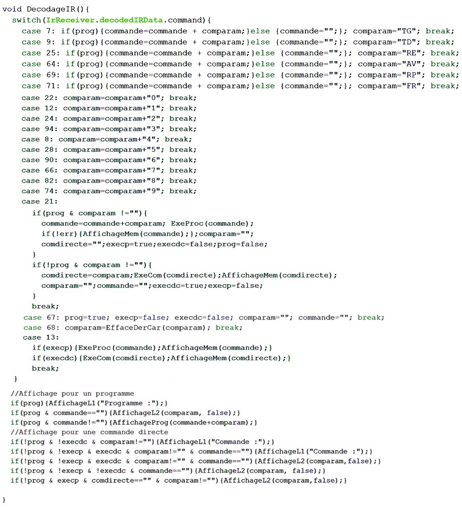 Ces fonctions devront être implémentées dans le programme de la tortue (un programme par type de télécommande puisque les touches ne sont pas toutes au même endroit pour la même fonction). Les Entrées/Sorties de la carte Uno R3 seront commandées par le programme de la tortue qui sera téléversé sur la carte, pilotant ainsi la tortue. Codage du programme Pour la télécommande Elegoo, on peut télécharger le programme de la tortue (TortueLogoS1.zip - 3 Ko) Pour la télécommande Carmp3, on peut télécharger le programme de la tortue (TortueLogoS2.zip - 3 Ko) Pour la télécommande Joy-it (vendu par Go Tronic), on peut télécharger le programme de la tortue (TortueLogoS3.zip - 3 Ko) Pour la télécommande à 17 touches de Keyestudio, on peut télécharger le programme de la tortue (TortueLogoS4.zip - 3 Ko) Ces programmes ne diffèrent que par la fonction de décodage des touches de la télécommande sauf pour la télécommande de Keyestudio qui est particulière (17 touches) et dont le programme possède moins de fonctionnalités (le mode direct et les instructions RP et FR ont été supprimés). Une fois le fichier correspondant à la télécommande téléchargé, il faut le copier du dossier Téléchargements vers le dossier Arduino et décompresser le fichier zip. On obtient alors le dossier TortueLogoS qui contient le fichier TortueLogoS.ino Lancer l'IDE d'Arduino et par le menu Fichiers puis Ouvrir, parcourir les dossiers jusqu'au dossier Arduino puis TortueLogoS et cliquer sur le fichier TortueLogoS.ino. Le programme apparaît alors sur l'écran de l'ordinateur. Le programme ci-dessous est celui de la télécommande Joy-it. Le programme commence par le lier aux bibliothèques nécessaires du domaine public (crées par d'autres programmeurs) : //Ce programme utilise les bibliothèques IRremote, Stepper et LiquidCrystal_I2C #include "IRremote.h" #include <Stepper.h> #include <LiquidCrystal_I2C.h> Les lignes suivantes du programme déclarent les constantes et variables globales nécessaires au programme : const int pasParTour = 2048; //nombre de pas par tour du moteur const double diamRoue=6.7; // diamètre (en cm) des roues motrices (à modifier éventuellemnt) const double distIntRoue=15.58; //distance (en cm) entre les deux roues milieu à milieu (à modifier éventuellement) const double pi=3.14159265; int receiver = 12; //Signal Pin of IR receiver to Arduino Digital Pin 12 String commande=""; //variable pour mémoriser les commandes d'une procédure String comdirecte=""; //variable pour mémoriser une commande directe String comparam=""; //variable pour mémorisée 4 caractères (commande avec paramètre) double peri=pi*diamRoue; //distance pour un tour de roue soit le périmètre de la roue double disang=pi*distIntRoue/360; // distance à parcourir pour 1 degré bool proc=false; //pour passer en mode procédure bool execp=false; //pour programme exécuté bool execdc=false; //pour commande directe exécutée Remarques : - avec 2048 pas par tour, un pas mesure (en cm) le périmètre de la roue divisé par 2048 soit : péri/pasParTour - la distance à parcourir par les roues pour faire tourner la tortue de 1° est : le périmètre du cercle de diamètre 15,5 cm divisé par 360 : ![]() L'écran LCD étant relié aux pins A4 et A5 (SDA en A4 et SCL en A5), la suite du programme initialise les Moteurs et l'écran LCD : LiquidCrystal_I2C lcd(0x3F,16,2); //initialise l'écran LCD Série dont l'adresse est : 0x3F ou 0x27 Stepper MoteurPasAPasD(pasParTour, 8, 10, 9, 11); //initialise la librairie du moteur droit avec les pins de 8 à 11 Stepper MoteurPasAPasG(pasParTour, 4, 6, 5, 7); //initialise la librire du moteur gauche avec les pins 2 à 5 Viennent ensuite les procédures et fonctions du programme, d'abord celle qui découpe le programme Logo en commandes exécutables. La procédure ExeProg Le programme Logo (issu de la fonction gérant les touches de la télécommande qui sera décrite après), est une chaîne de caractères de la forme suivante : "AV10TD90AV15TG120...". Dans la procédure ExeProg ci-dessous, le nombre de pas est limité à 999 (soit environ 10 m) et la mesure de l'angle à 999°. Cette procédure fractionne la chaîne en commandes simples en utilisant une boucle while condition (jusqu'à ce que la chaîne soit parcourue en entier). Cette boucle envoie chaque commande exécutable (pascom : avec l'exemple précédent pascom = "AV10" puis "TD90"," AV15", "TG120",...) à la procédure ExeCom. Mais si la commande exécutable pascom commence par "RP" (Répète) alors la partie de la chaîne contenue entre "RP" et "FR" (Fin Répète) est traitée par la fonction TraitRepete. ![]() La fonction TraitRepete Cette fonction extrait d'abord le nombre nbr de répétition puis détecte la fin de la chaîne à répéter pour extraire du programme Logo la chaîne à répéter. Cette chaîne est renvoyée à la procédure ExeProg autant de fois que le nombre de répétition. A la fin de la fonction TraitRepete, est passé le pointeur sur le début de la prochaine commande exécutable du programme Logo à la fonction ExeProg qui reprend la main et traite la suite du programme si nécessaire. ![]() La procédure ExeCom Cette procédure décompose une commande provenant d'un programme ou d'une commande directe (par exemple "TG120") en la partie instruction de déplacement (ici "TG") et le nombre qui suit (ici "120") et les envoie à la procédure Moteurs. ![]() La procédure Moteurs Elle met en marche les moteurs avec les paramètres qui lui sont passés c'est à dire une instruction de déplacement (commande : AV, RE, TD ou TG,) et un nombre (pasang : pas ou angle). ![]() Il y a quatre traitements différents, un pour chaque instruction de déplacement. Pour chacune de ces instructions, le traitement consiste à calculer le nombre de tours nécessaires en fonction du deuxième paramètre passés à la fonction (pasang) et des propriétés physiques de la tortue (diamètre