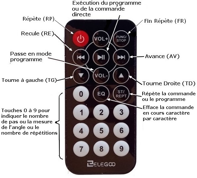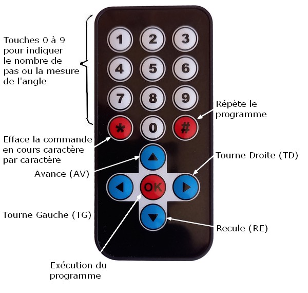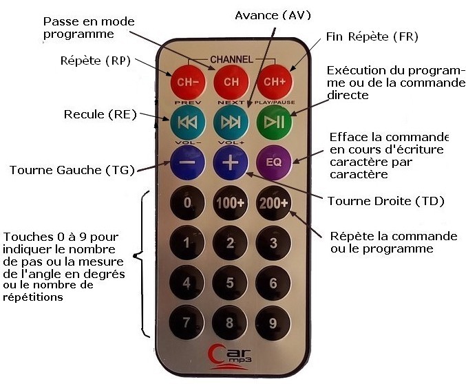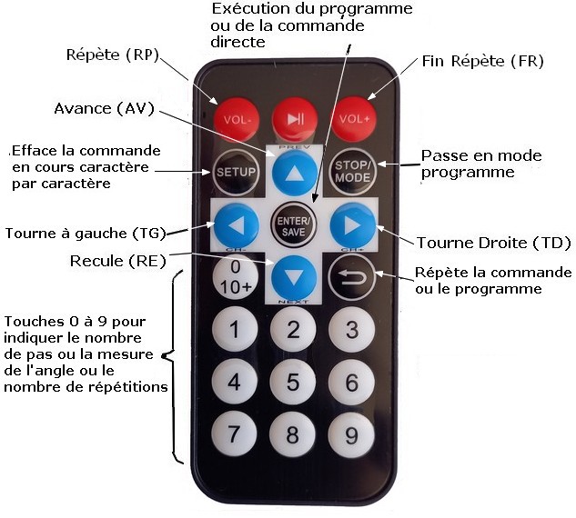 Programme de la tortue Ce programme doit être adapté à la télécommande choisie et répondre à certaines possibilités (cahier des charges). Cahier des charges La tortue doit pouvoir se mouvoir sur un plan (le sol, une table, ...) en répondant à des instructions de déplacement : AV pour avance, RE pour recule, TD pour tourne à droite, TG pour tourne à gauche. Avec les télécommandes à 21 touches on pourra aussi utiliser les instructions de répétition RP (pour Répète) et FR (pour Fin Répète) pour répéter un certain nombre de fois (à indiquer juste après l'instruction RP) les commandes encadrées par RP et FR. On retrouve donc le langage Logo réduit à ces quelques instructions (Logo est bien plus riche). Les instructions AV et RE doivent être suivies par un nombre de pas de 0 à 999 (un pas fait 1 cm) Les instructions TD et TG doivent être suivies par la mesure d'un angle exprimée en degré de 0 à 360. Toutefois on pourra indiquer un angle supérieur à 360° (jusqu'à 999°) mais il lui sera retiré 360° autant de fois que nécessaire pour obtenir un angle inférieur ou égal à 360°. Par exemple un angle de 420° sera en réalité un angle de 60° (420 - 360 = 60). Une instruction de déplacement suivi par un nombre (inférieur à 999), c'est à dire une commande, peut être exécutée directement (mode direct, sauf avec la quatrième télécommande qui ne possède que 17 touches) ou enregistrée en mémoire suivie par d'autres commandes (mode programme). Un programme, une fois exécuté devra pouvoir l'être de nouveau (à l'identique) par une touche dédiée. Pour une plus grande souplesse, on devra pouvoir effacer une partie ou la totalité d'une commande aussi bien en mode direct qu'en mode programme. Les commandes seront tapées avec les touches de la télécommande choisie, il faut donc attribuer des fonctions aux touches.